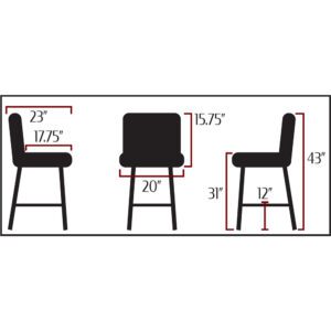 - Overall dimensions: 43″ H x 20″ W x 23″ D (31″ H to top of seat / 12″ to top of footrail)