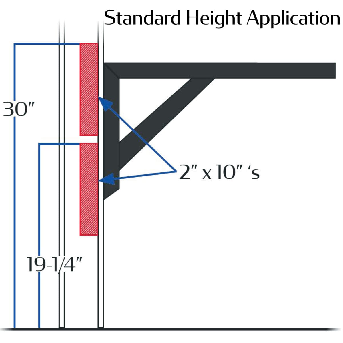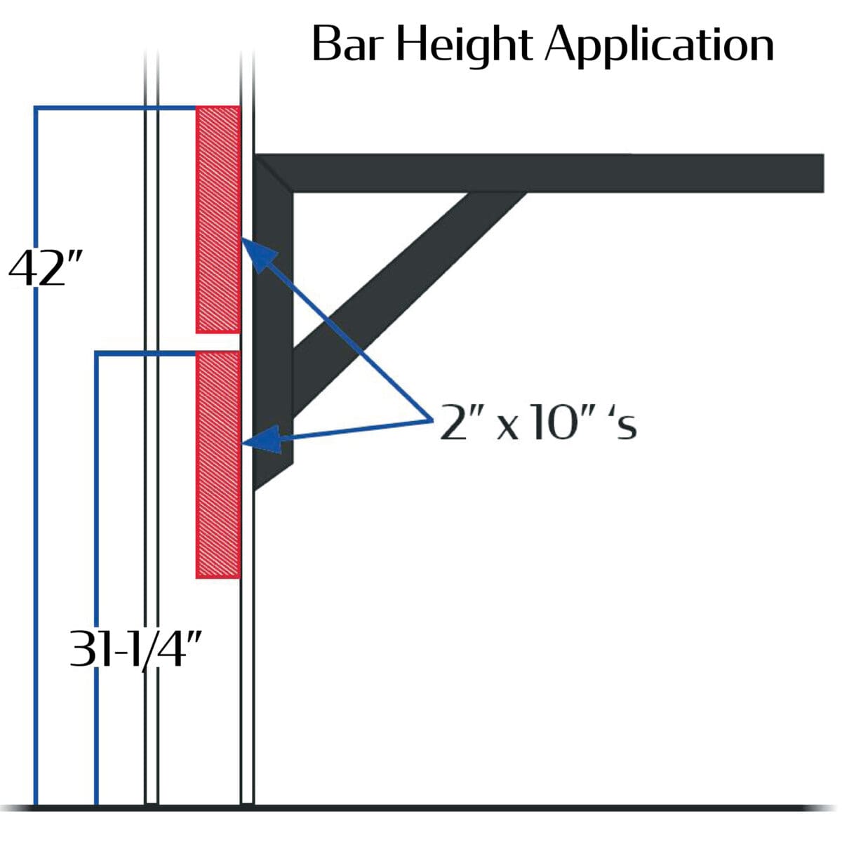 - NOTE: Requires reinforced wall (see images) *30″ top 2×10 height for standard height; 42″ top 2×10 height for bar height*