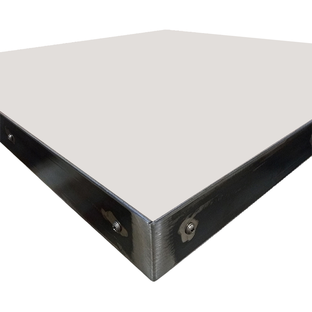 • 1-1/8″ thick, 45 lb. industrial-grade particle board core with 2″ hot-rolled, 11 gauge steel edge with exposed fasteners
