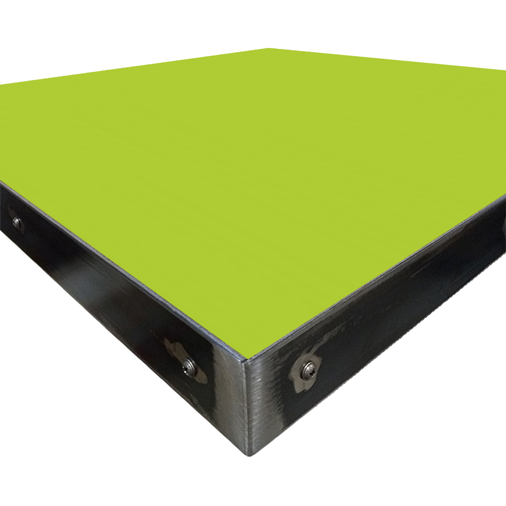 • 1-1/8″ thick, 45 lb. industrial-grade particle board core with 2″ hot-rolled, 11 gauge steel edge with exposed fasteners