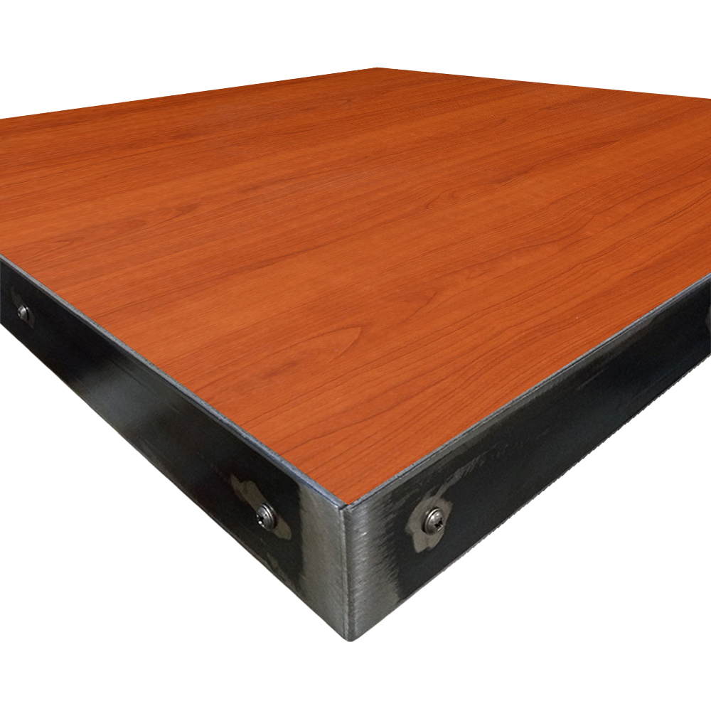 • 1-1/8″ thick, 45 lb. industrial-grade particle board core with 2″ hot-rolled, 11 gauge steel edge with exposed fasteners