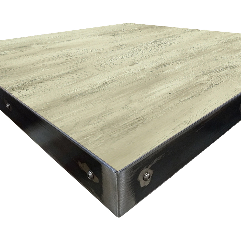 • 1-1/8″ thick, 45 lb. industrial-grade particle board core with 2″ hot-rolled, 11 gauge steel edge with exposed fasteners